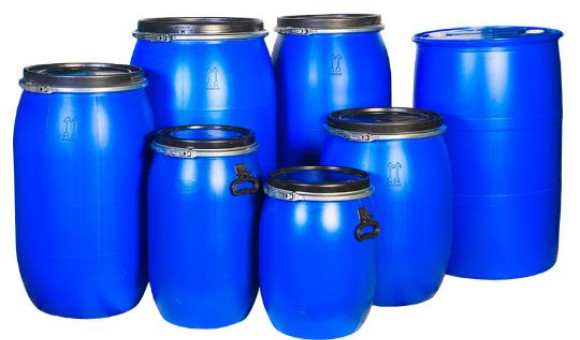 - Бочка пластиковая со съёмной крышкой и металлическим хомутом объёмами 48, 65, 100, 127 и 227 л